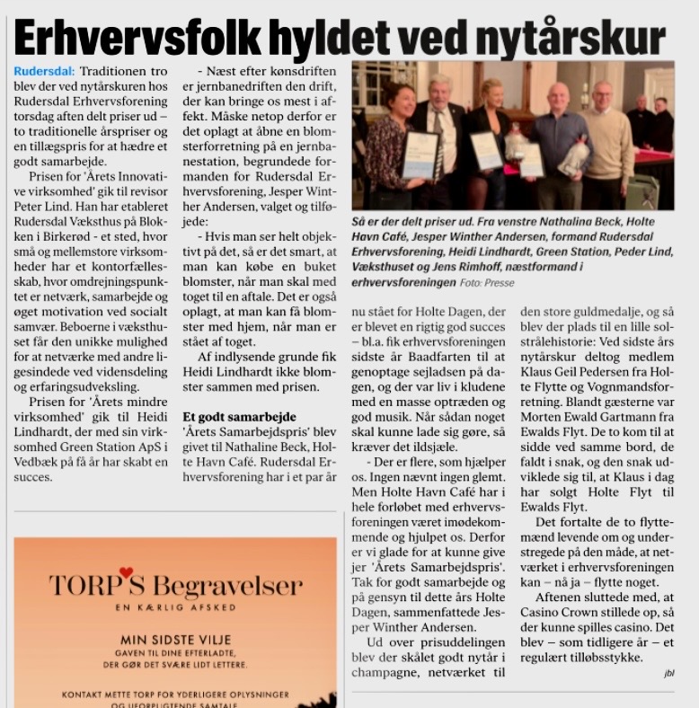 -Men faktisk var det Rudersdal Erhvervsforening, der for en halv snes år siden foreslog kommunen at holde nytårskur og uddele erhvervspriser. Den idé tog kommunen til sig. På kommunens nytårskur i år fik vores medlem Slagter Maltesen overrakt en erhvervspris. Hjerteligt tillykke med det. Det sjove er, at vi netop gav Maltesen en af vores erhvervspriser for nogle år siden. Endda med samme begrundelse som kommunen nu har brugt – kvalitet og service. Vi luner os ved, at vi helt åbenbart viser vejen for kommunen, konkluderer Jesper Winther Andersen.